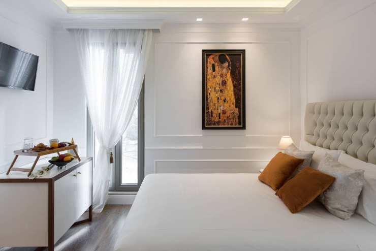 這房間的設計靈感來自於奧地利知名畫家 Klimt,牆上掛著他的畫作複製品,而另一個房間的主題是達文西 Da Vinci。