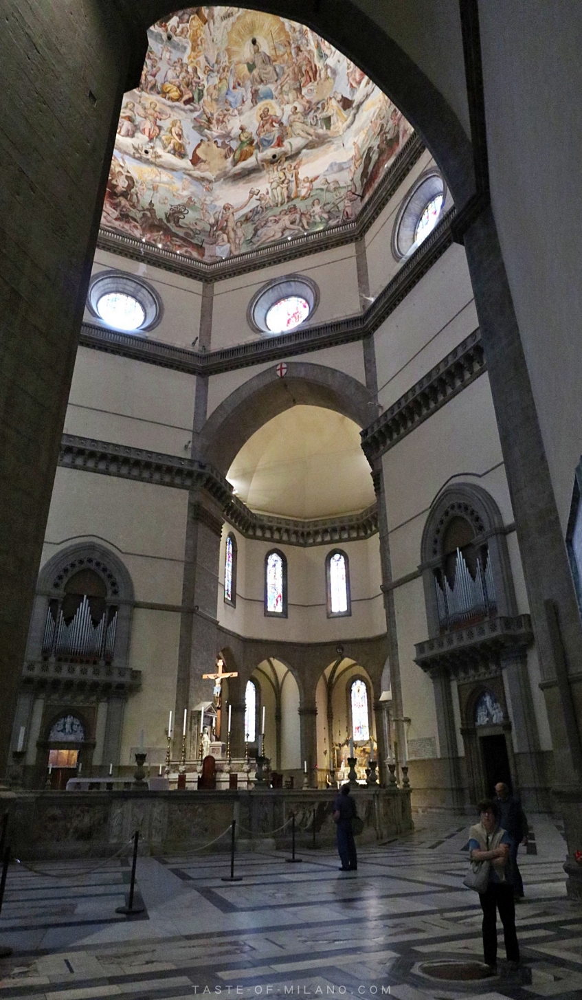 偉人 Brunelleschi 用盡全力去完成紅磚穹頂,可惜遺下穹頂的內部裝飾還未完成便離世了,他原本的構思是以金色馬賽克圖案鑲嵌在穹頂天花上,這樣可以充分利用穹頂小窗戶透入的光線拆射來照亮內部,在他去世後,穹頂內部只刷上白色油漆。