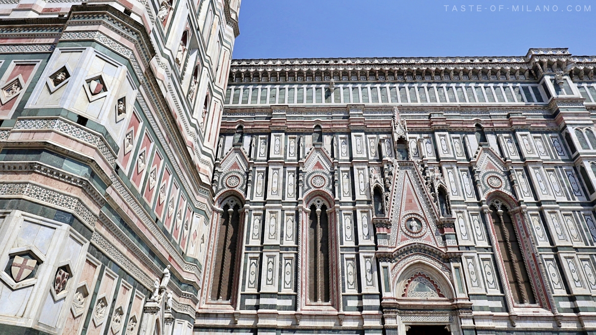 百花大教堂在 1412年獻給花之聖母瑪利亞,其花是指聖潔的百合花,也是佛羅倫斯市的象徵。立面及外牆以白、綠、粉紅三種顏色的大理石拼合而成,分別來自於鄰近城市 Carrara(白)、Prato(綠)、Siena(粉紅),是托斯卡納地區的一大建築特式。