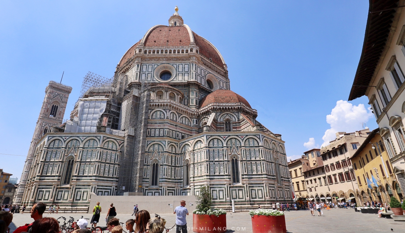 這教堂最有看頭的是差點因技術問題而興建不成、世上最大的磚石穹頂,試想想一座目標要成為全意大利最大的教堂竟然是沒頂的有多尷尬,而且還恥辱地光著頭活了百多年之久,最後得到天才金匠布魯內萊斯基(Filippo Brunelleschi)自薦,以其一直沒有公開的絕密秘技、花了16年時間建成,下篇有關大教堂登頂遊記內將會詳細介紹。