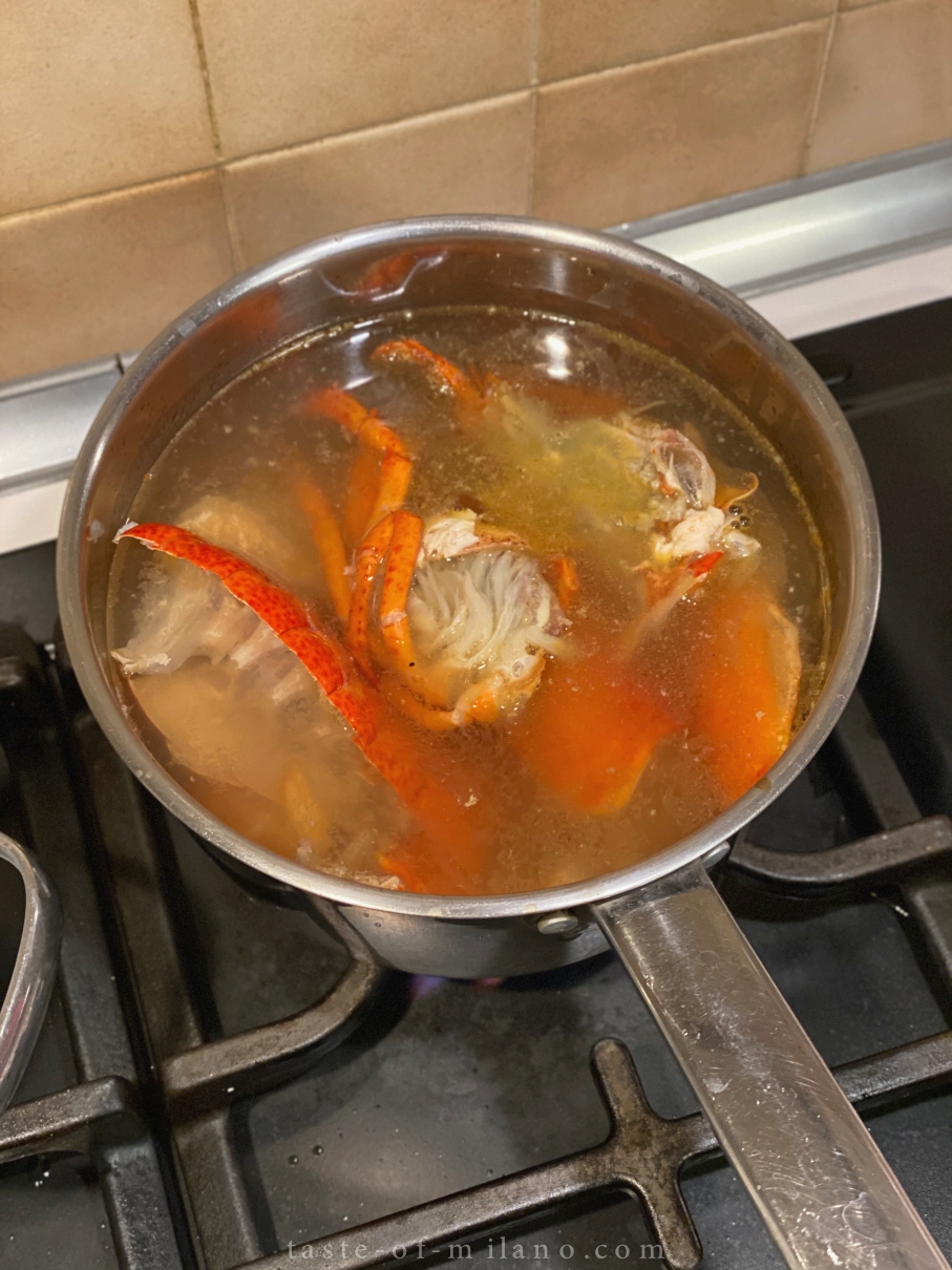6. 少許油爆香洋蔥,加入兩種蝦頭及殻爆香,加入水、西芹、紅蘿蔔、歐芹煮滾後轉慢火,煮至少半小時,若有時間可煮至1小時,煮的時候把龍蝦頭壓一壓更出味