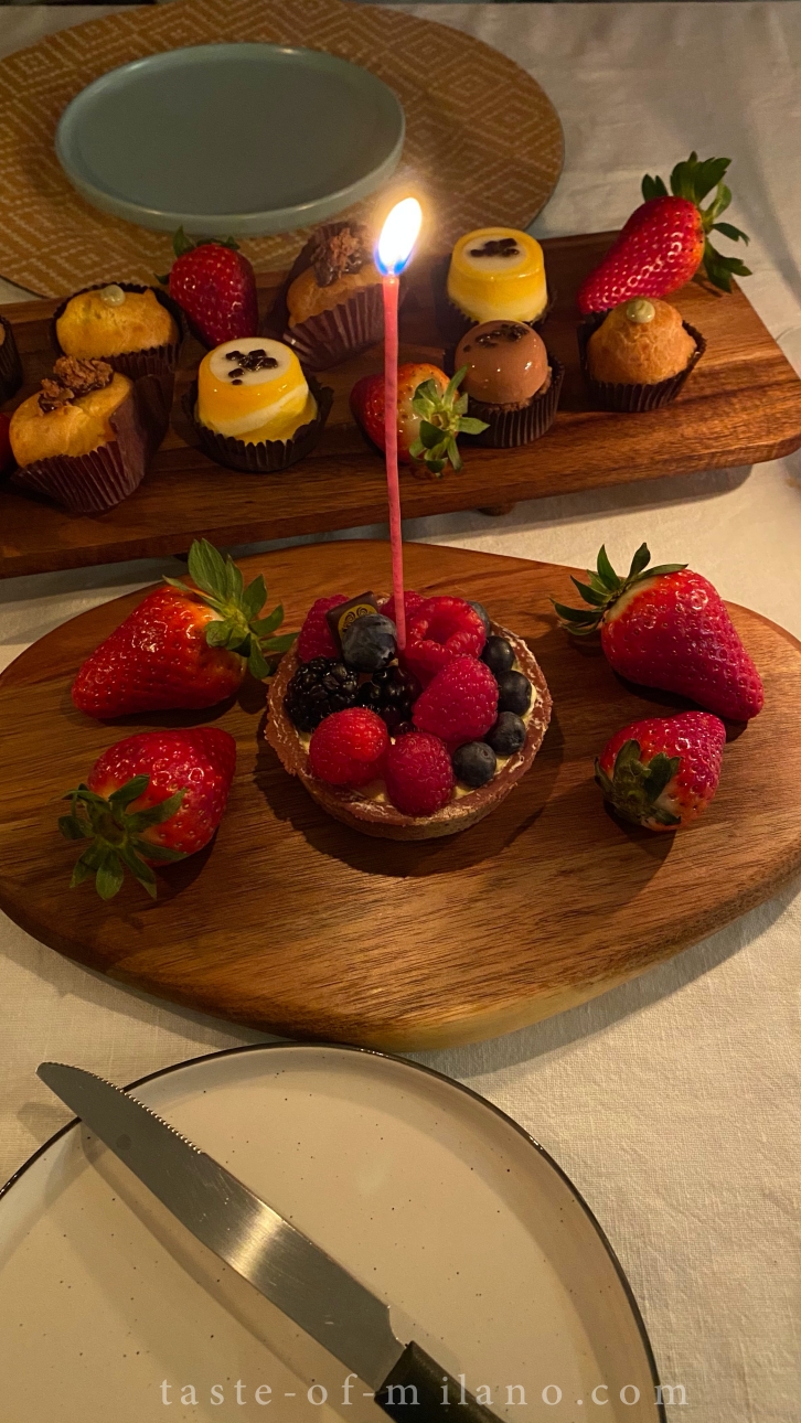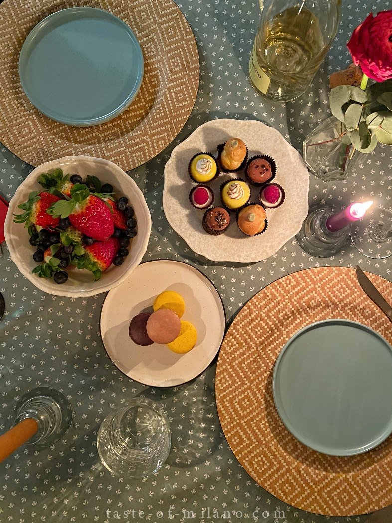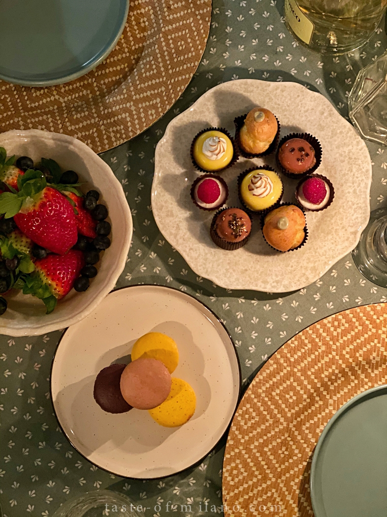 比較貪心想嚐試不同口味,於是在餅店買了雜錦小甜品 Pasticcini mignon 及馬卡龍,加上新鮮水果及香檳,美味的配搭。