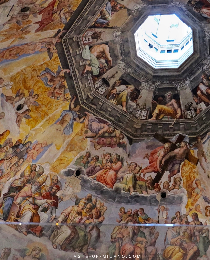 登頂中途,會走過穹頂內部的兩條高空走廊,可以近距離欣賞教堂的彩繪玻璃窗,以及著名的穹頂壁畫《最後的審判》