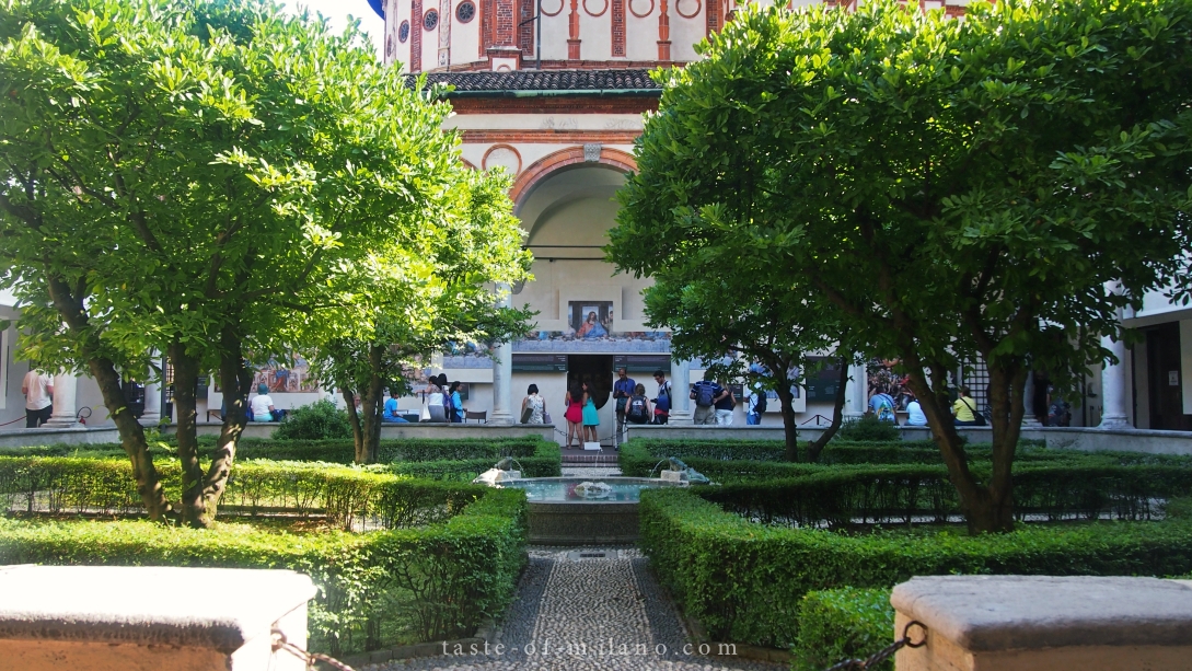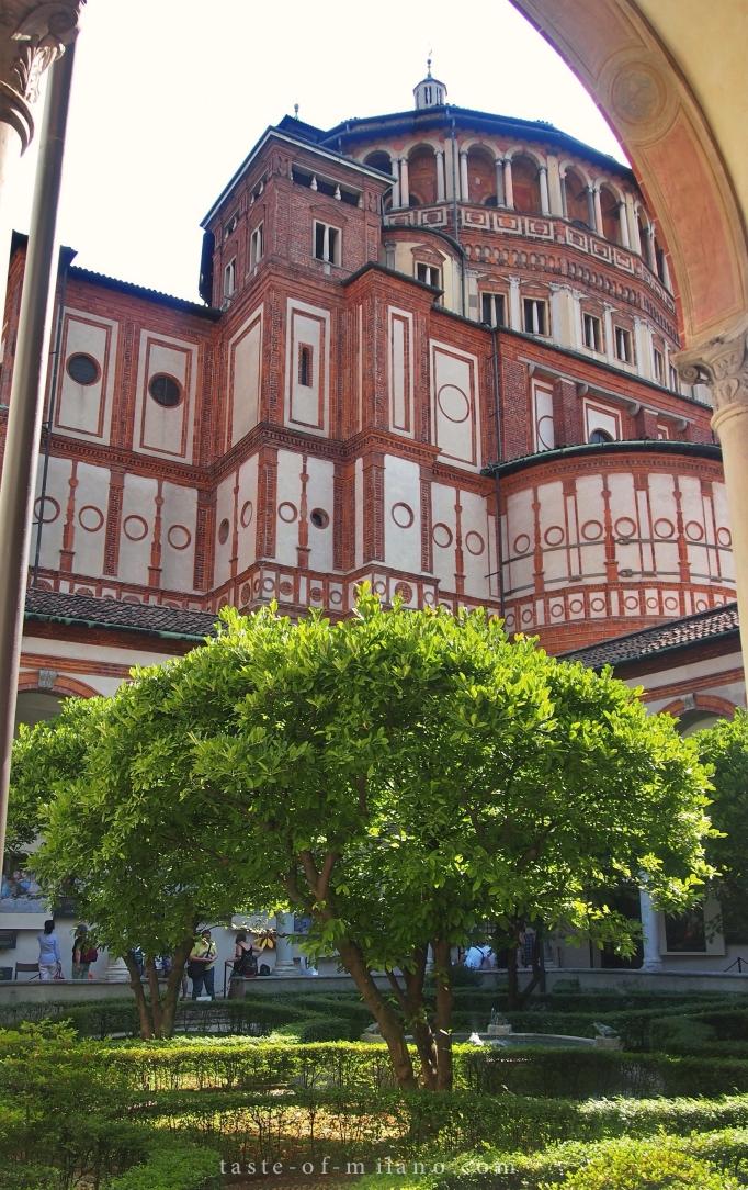在教堂內的庭園可近距離欣賞布拉曼特的建築