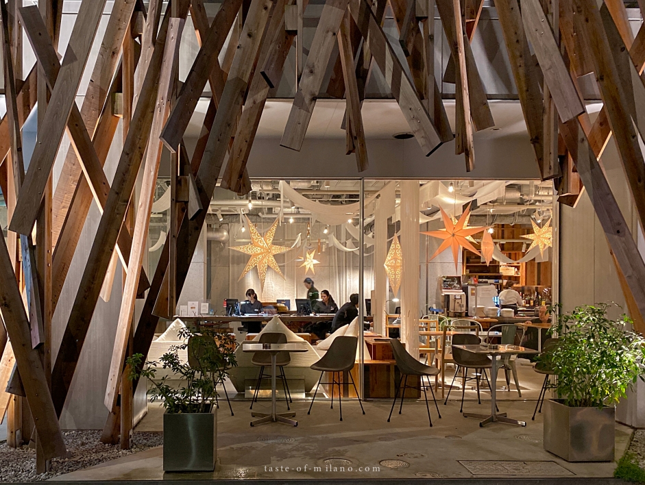 交錯的木條設計似曾相識,同樣是大師喜愛的設計元素,讓人想起九州福岡縣太宰府的 Starbucks 店,以及東京南青山的微熱山丘店,這個設計已經成為其標誌,一眼就能認出是大師的作品。