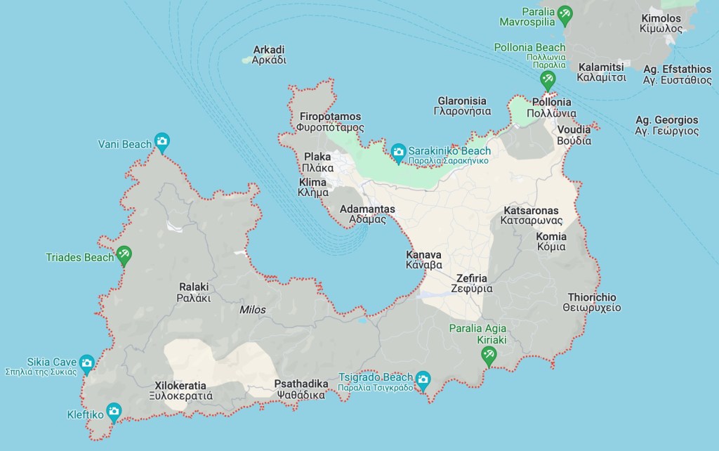 馬蹄形的米洛斯島,港口 Adamantas 位於島的中心,由這裡出發到達主要景點也非常方便,是島上生活設備最齊全的區域,我們這次的酒店就在距離約 5 分鐘車程的渡假酒店 Civitas Milos(容後介紹)。